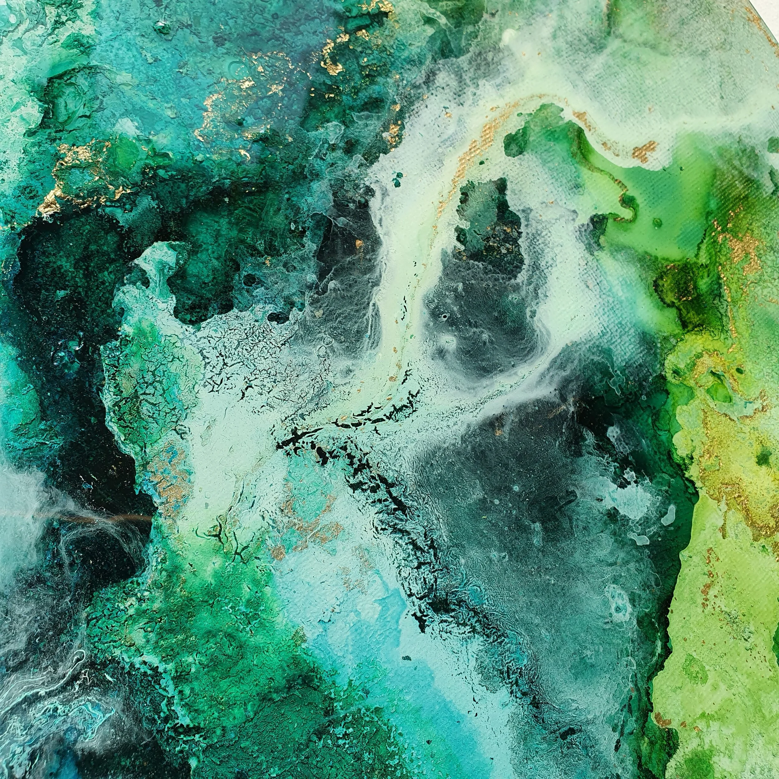 To represent the choices we make through life that affect the relationships and friendships we have, Katie created pathways across this piece using gold, hand painted white and iridescent dots and resin detailed lines. All of these paths were intentionally created, some ending suddenly, some stopping and starting, some fading and some continuing across the entire piece. The piece is entirely green to symbolise life and calmness, to remain calm despite the choices we make and to trust in lifes path, bringing the deeper concept together with the colour.